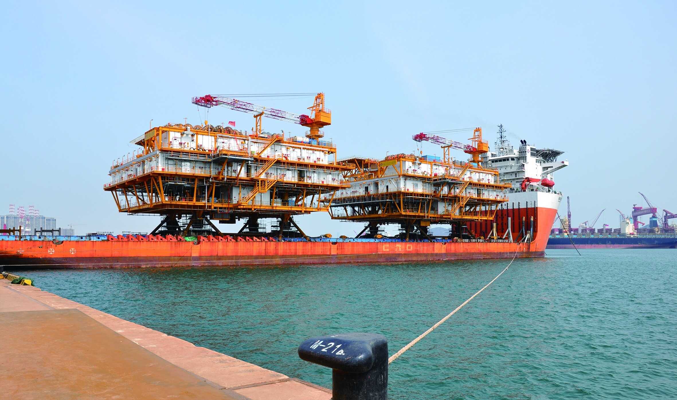 我國渤海最大海上油氣平臺—— 墾利10-2油田群開發項目(一期) 中心處理平臺在山東青島離港起運
